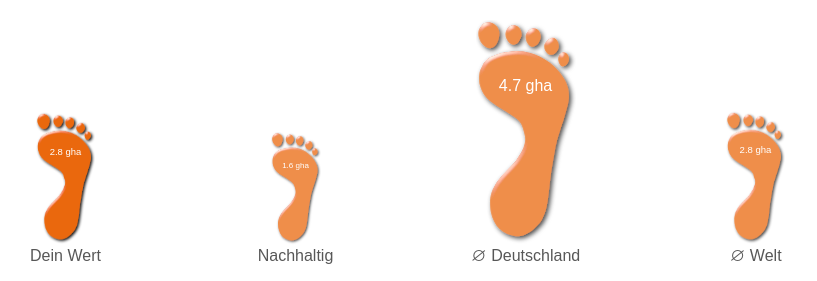 Mit 2,8 gha (globalen Hektar) liege ich zwar deutlich über einem nachhaltigen Fußabdruck, aber auch deutlich unter dem deutschen Durchschnittswert. Den Wert von 1,0 gha zu erreichen ist schwierig, da pauschal 0,9 gha als Sockelbeitrag für die Infrastruktur in Deutschland eingerechnet werden. Um diese zu beeinflussen, braucht es den ökologischen Handabdruck. (Quelle: https://www.fussabdruck.de/)
