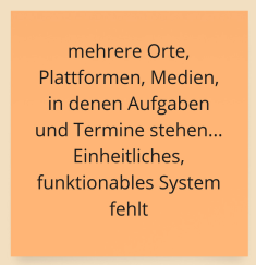 Kernproblem: ich habe keinen Arbeitsalltag im engeren Sinne (verschiedene Tätigkeiten/Arbeitsfelder) → der Zeitaufwand für einzelne Aufgaben ist nicht abzuschätzen → Gefühl der zeitlichen Orientierungslosigkeit.