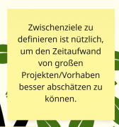 Aus den langfristigen Zielen lassen sich dann kleinere, konkrete Projekte ableiten. Diese Zwischenziele oder Meilensteine sind in sich abgeschlossen und sind Voraussetzungen für das große Ziel. Indem das große Ziel in kleinere Ziele heruntergebrochen wird, wird es übersichtlicher und wirkt weniger überfordernd.